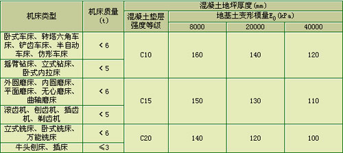 采用彈性連接的中小型機床均可直接安裝在混凝土地坪上。國內(nèi)曾對76家工廠機床安裝在地坪上的情況進行過調(diào)查統(tǒng)計,并做了有關(guān)的專題試驗,提出了可安裝在混凝土地坪上的中小型普通機床,其類型、機床質(zhì)量和對地坪的要求見表2。