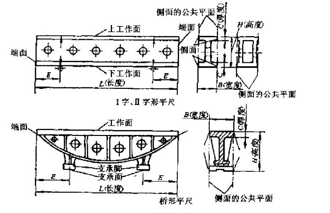 常用的鑄鐵平尺有Ⅰ字、Ⅱ字形平尺和橋型平尺兩種。Ⅰ字、Ⅱ字形平尺用于檢驗狹長導軌平面的直線度,亦可作為過橋來檢驗兩導軌平面的平行度;橋型平尺不僅可檢查狹長導軌平面的直線度,而且可作為刮削狹長導軌面時涂色研點的基準研具。