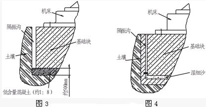 (4)超精密機床,如導軌磨床、軋輥磨床等,其防振方法是采用彈性支承部件將整體的基礎塊懸浮起來。近年來有人認為這種方法的效果往往不能令人滿意,推薦另一類形式,如圖3、圖4所示。