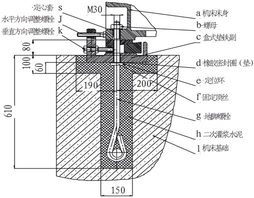 首先根據(jù)墊鐵與床身地腳厚度將定位環(huán)“f”調(diào)整好,保證地腳螺栓“g”與螺母“b”旋合后露出3-4個螺紋。同時將斜鐵調(diào)整成有三分之二可上調(diào)的狀態(tài)。接著在地腳螺栓“g”上裝入密封圈“d”,盒式墊鐵副“c”,組合后裝入床身地腳孔,然后裝入定心套“s”,最后用螺母“b”緊固,懸掛在床身下端。