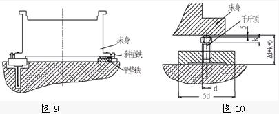 圖7中“d”所示為橡膠密封圈或墊,它的功能是防止二次灌漿時水泥向上串入墊鐵盒內(nèi)造成污染,以至破壞盒內(nèi)斜鐵各滑動精密配合表面,應注意保護其不破損,更不能漏裝。